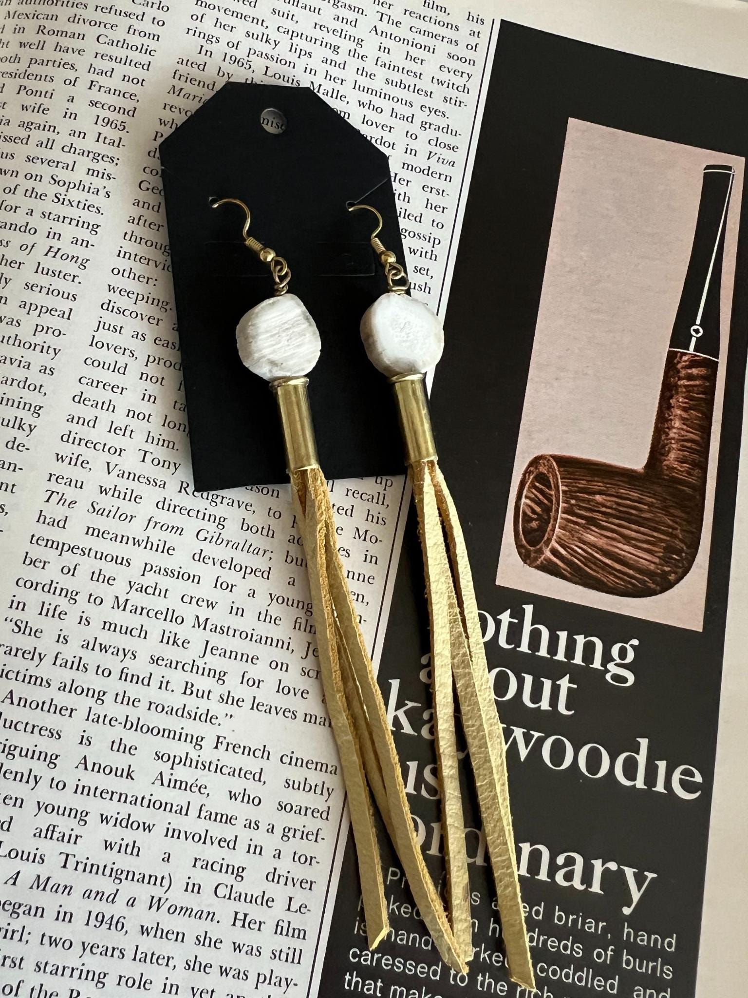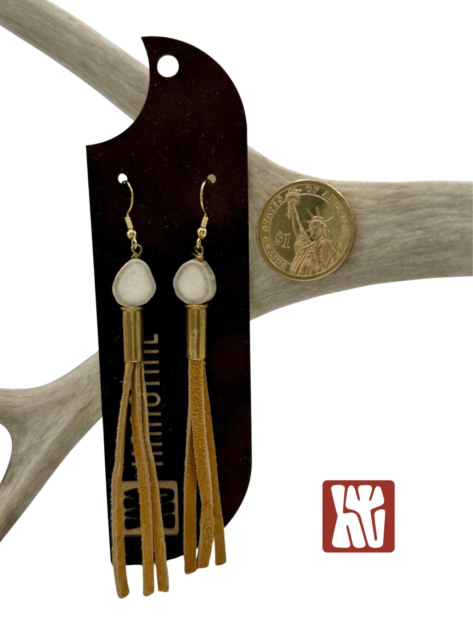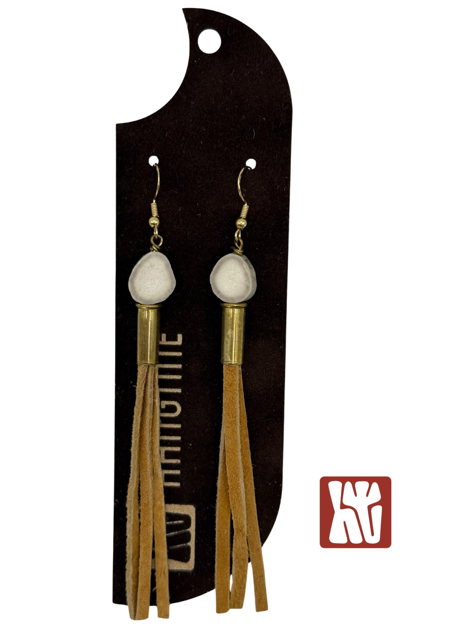 A bold collision of prairie toughness and bohemian cool. Each pair features authentic repurposed brass bullet casings. The leather fringe evoke vintage saddlebags and sunfaded suede jackets. These earrings reflect the raw beauty of the land they comes from. No two pieces are ever alike, each one carries the unique texture, color, and story of the materials used. The earrings are very lightweight and the earwires are 18K gold plated. They will measure between 3.5-4.5" in length (easily trimmed to your desired length). The precise color of the leather may be slightly lighter or darker than pictured and the shape of the antler will vary and be unique to each pair of earrings. These beauties are perfect for desert nights, dusty roads, or anyone carrying the West in their bones.