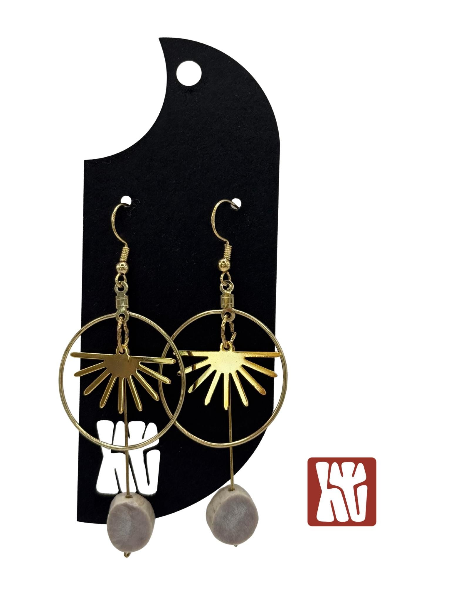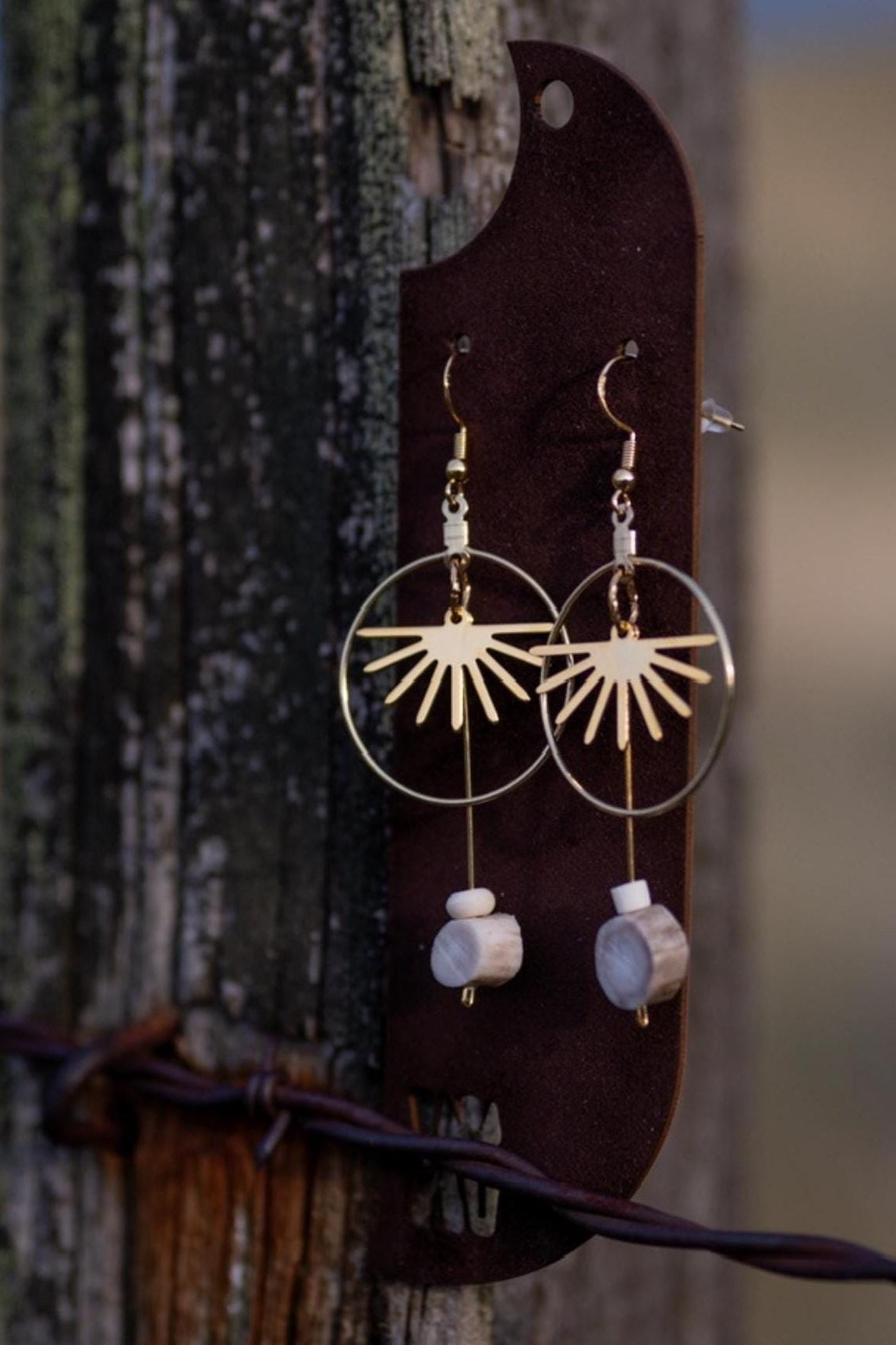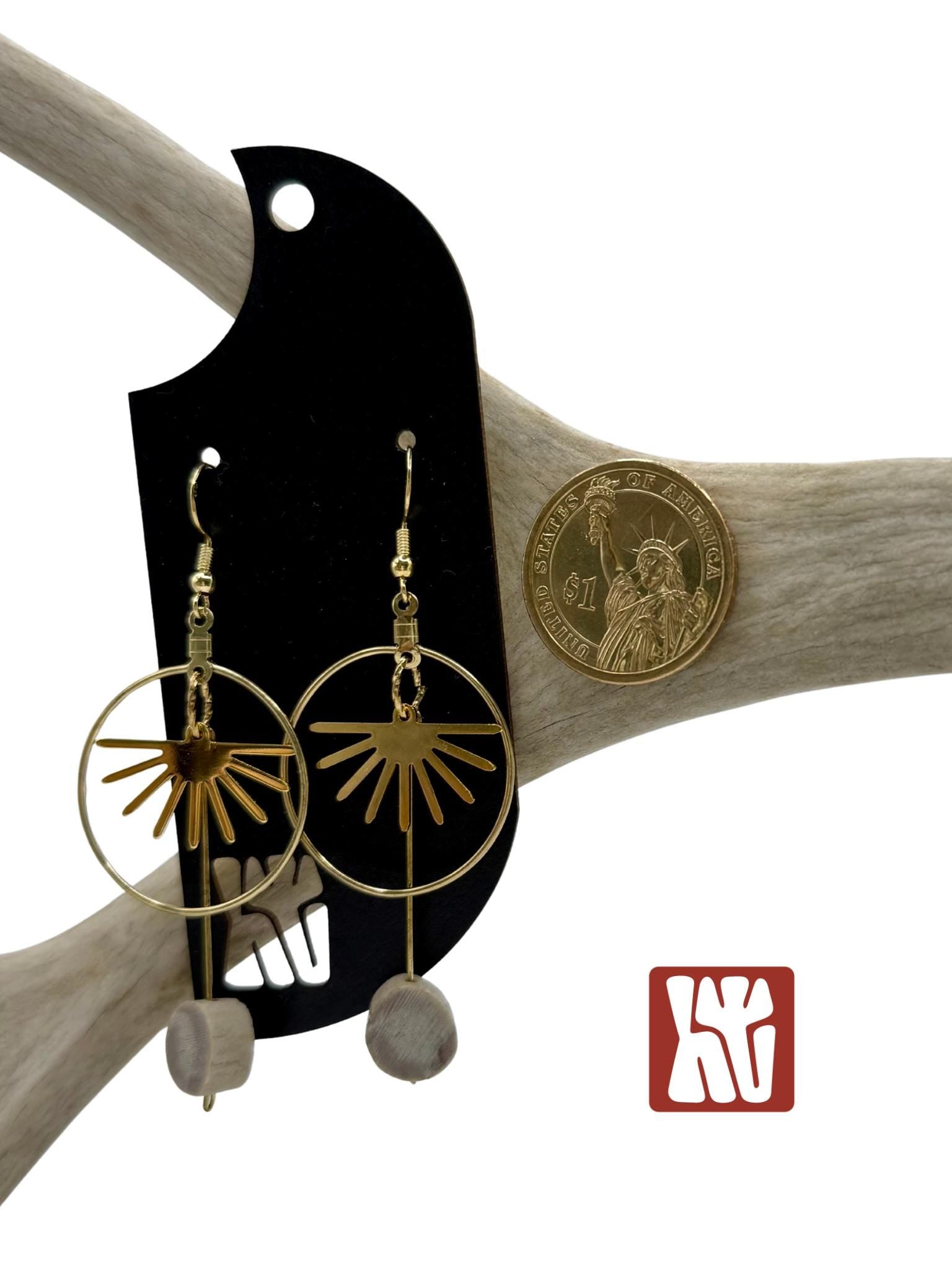 Montana sunrise antler earrings, handcrafted under the big sky. Here at Hangtine I hand create each piece of jewelry from antlers I find while shed hunting in Montana. I have paired the antlers with 18K gold plated rising sun charms. Every piece reflects the raw beauty of the land it comes from. Each piece is unique, just like you! The earrings are very lightweight, the earwires are 18K gold plated and the earrings will measure approximately 3 in length. The color of the antler will be unique to each pair of earrings.