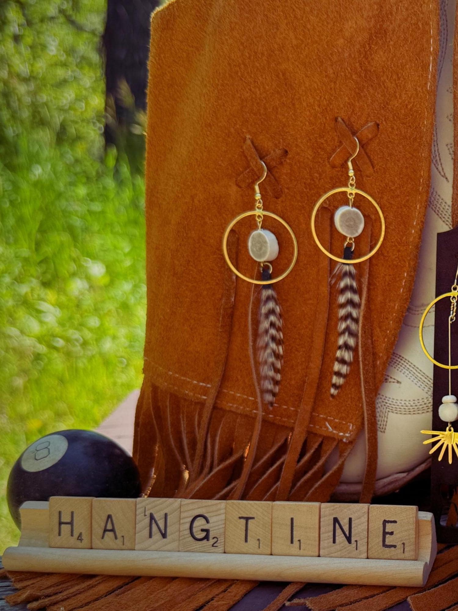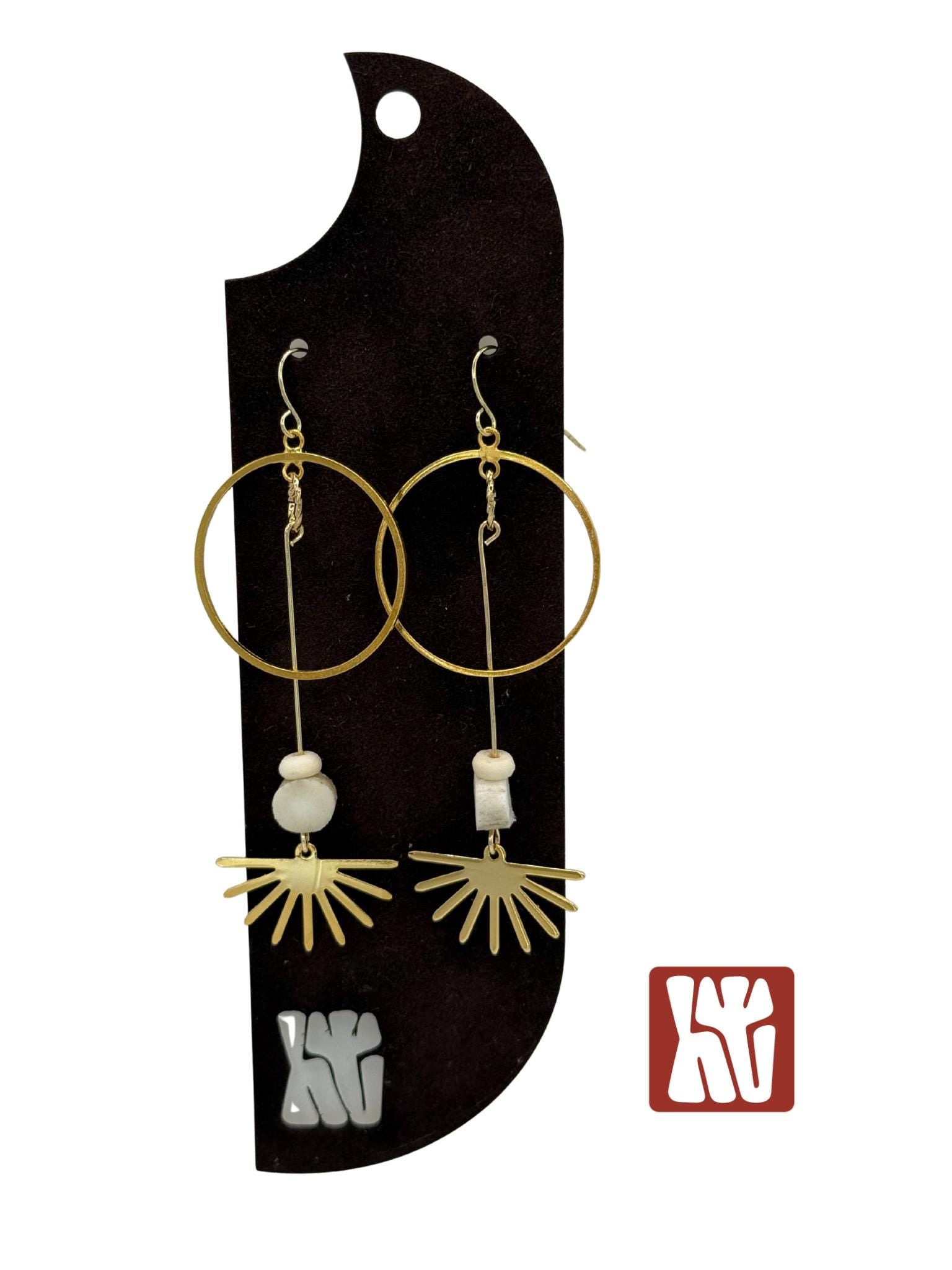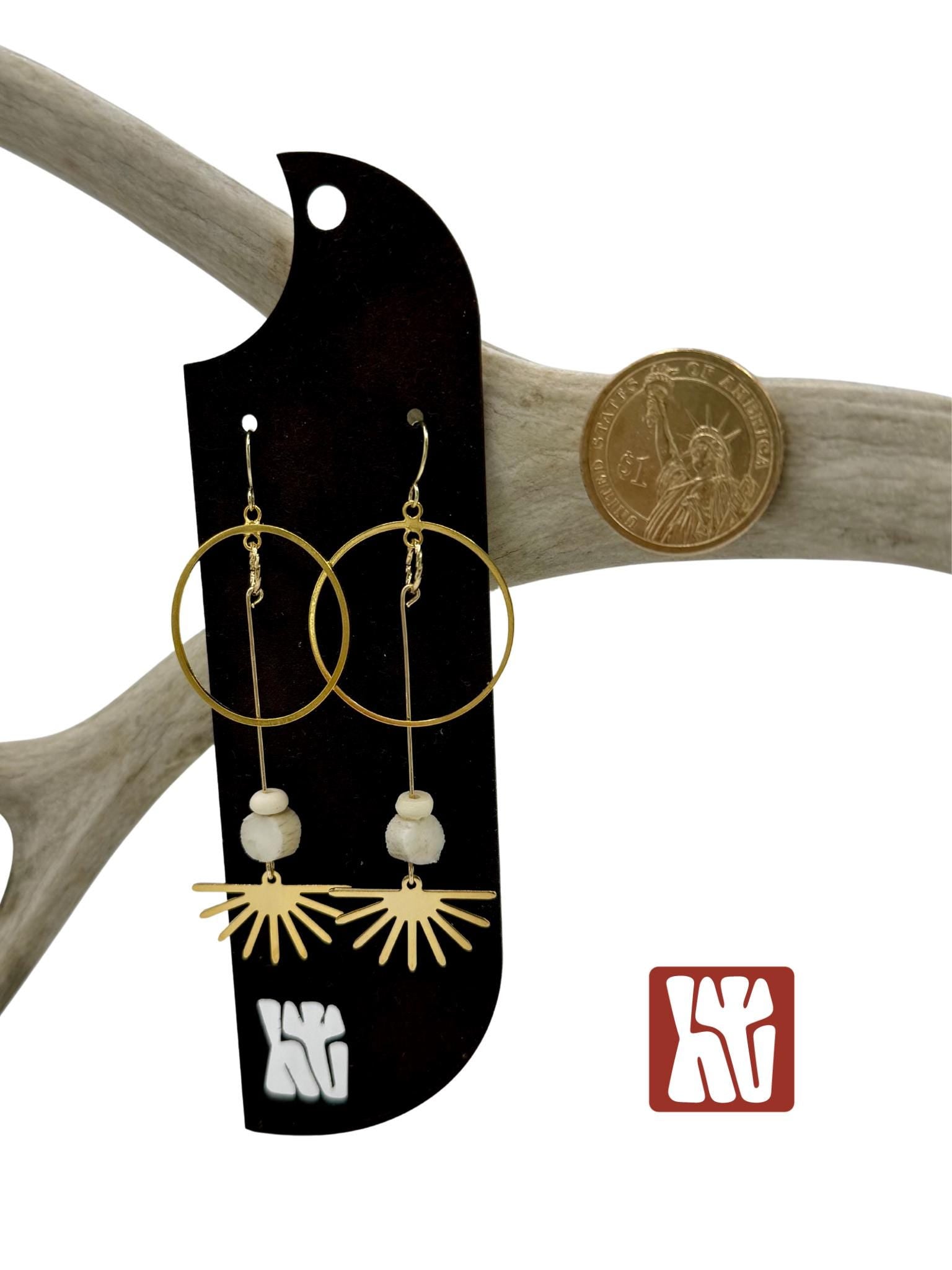 Light-catching and light weight, these earrings sway with a golden glow. Here at Hangtine I hand create each piece of jewelry from antlers I find while shed hunting in Montana. I have paired the antlers with bone beads and 18K gold plated rising sun charms. Every piece reflects the raw beauty of the land it comes from. No two pieces are ever alike, each one carries the unique texture, color, and story of the materials used. The earwires, rings and charms are 18K gold plated and the earrings will measure approximately 3.25" in length. The exact color, shape, and size of the antler will be unique to each pair of earrings. These are perfect for brunch, casual days or a night out with the girls!