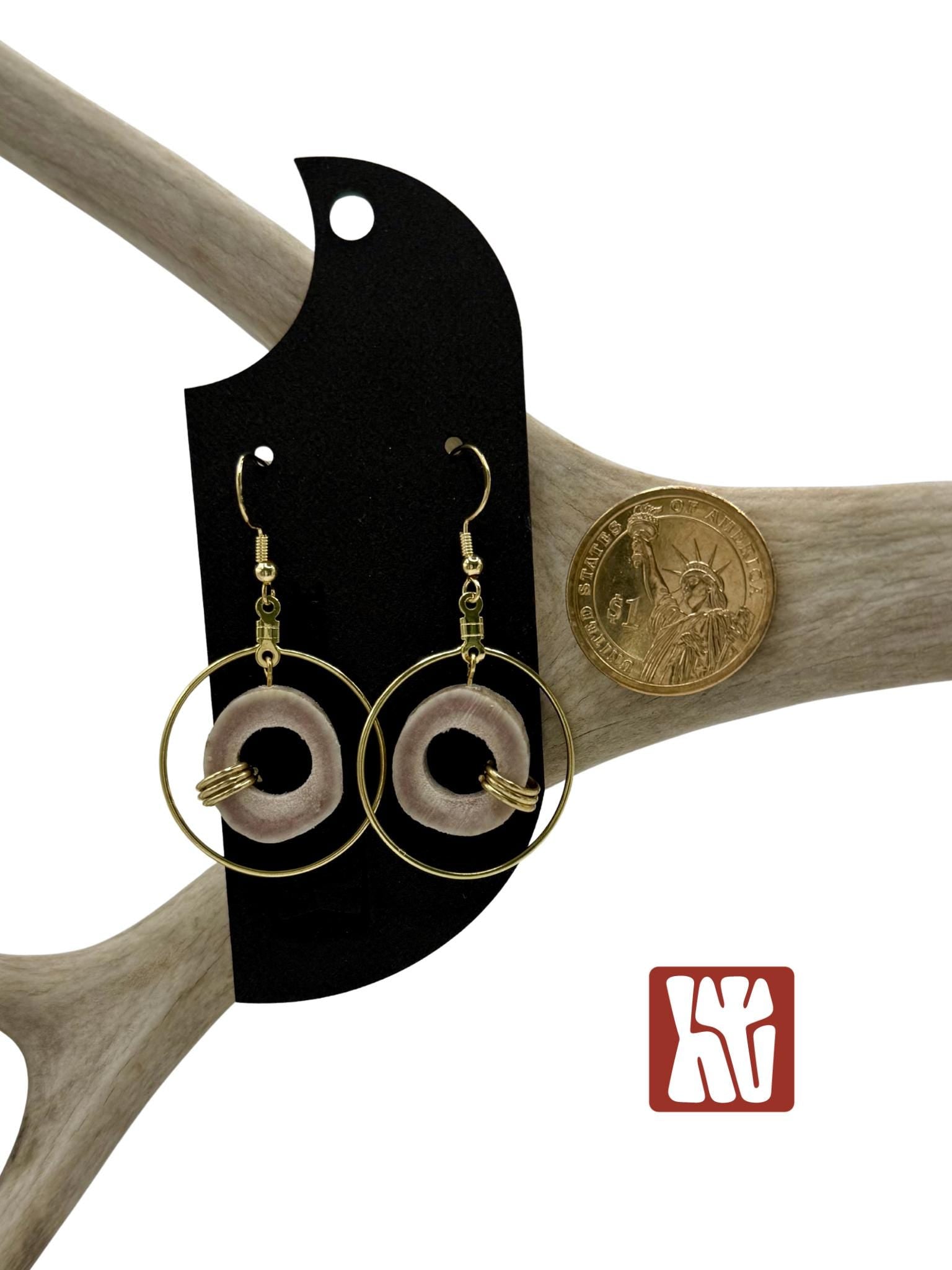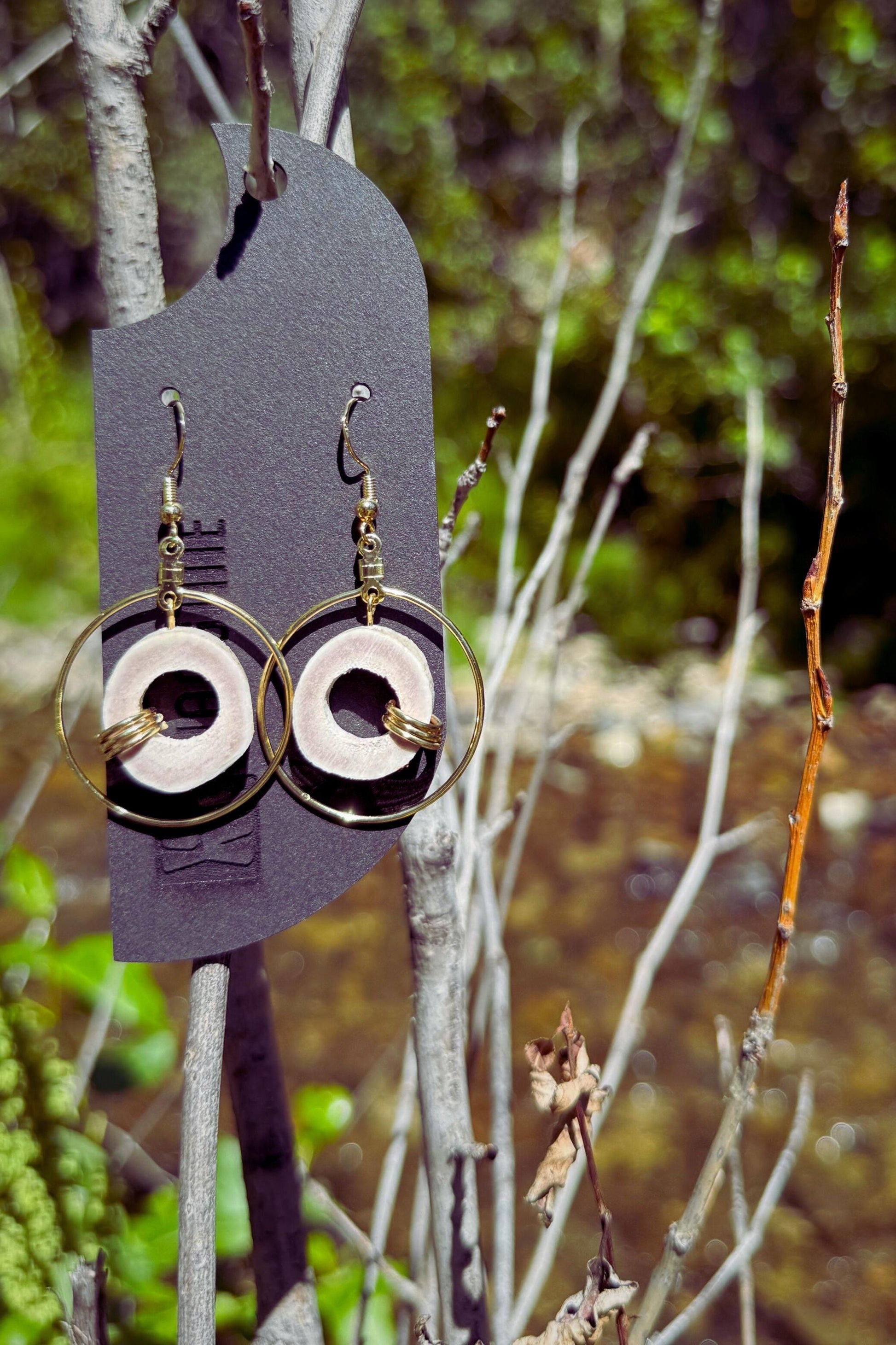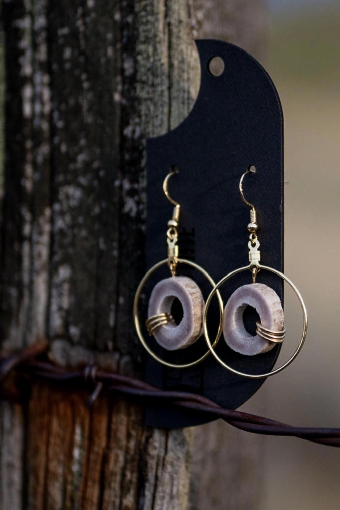 Channeling the golden glow of the 70's with the rugged charm of Montana. Here at Hangtine I hand create each piece of jewelry from antlers I find while shed hunting in Montana. Crafted from carefully drilled antlers and accented with warm gold rings, every piece reflects the raw beauty of the land it comes from. No two pieces are ever alike, each one carries the unique texture, color, and story of the materials used. The earrings are very lightweight, the earwires are 18K gold plated and the earrings will measure approximately 2.12" in length. The color and shape of the antler will be unique to each pair of earrings. These earrings are like the sun hitting the grass at golden hour!