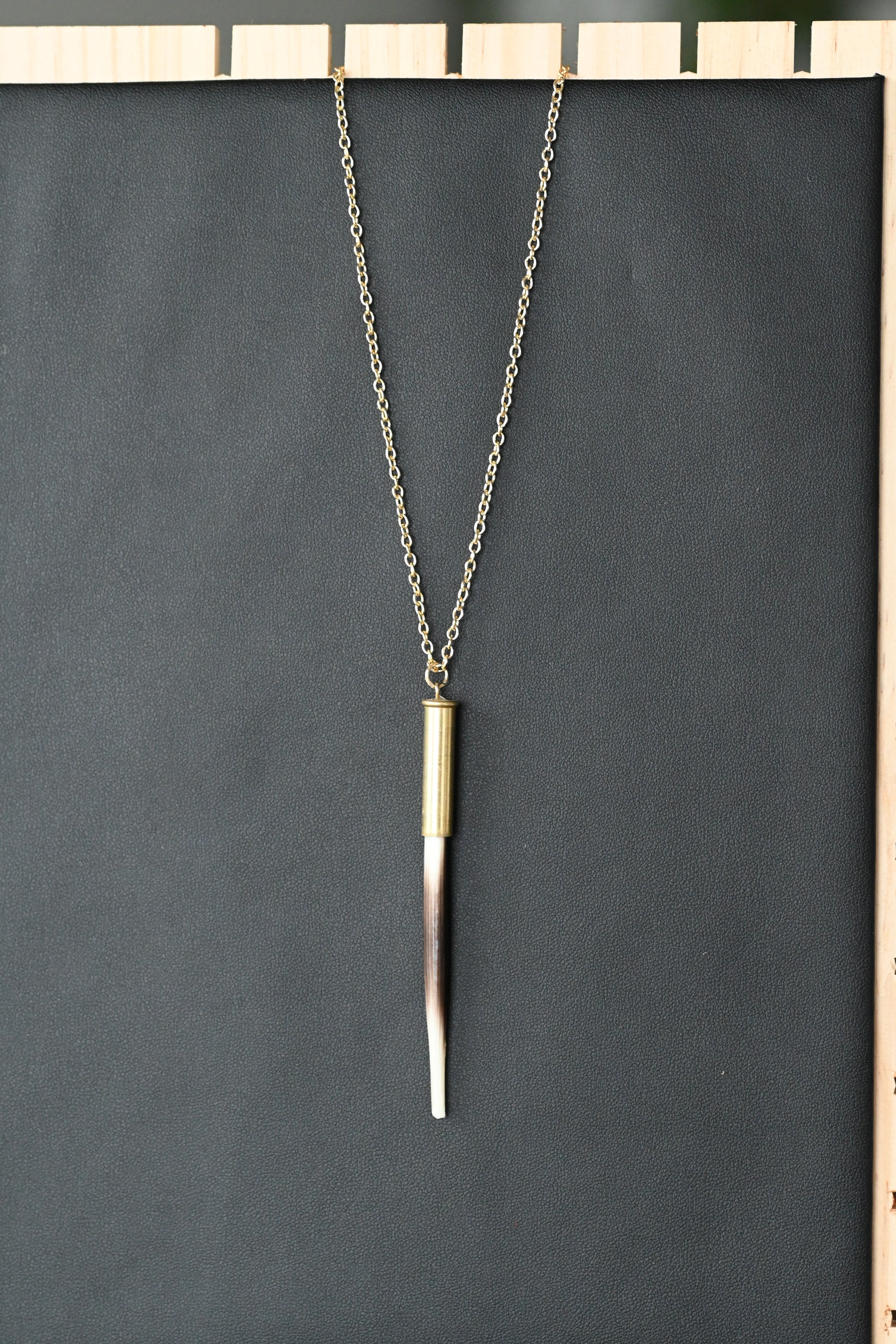 This striking necklace merges rugged Western aesthetics with artisanal craftsmanship. A repurposed bullet casing pairs with an authentic African porcupine quill, creating a bold statement piece that celebrates both heritage and sustainability. Each necklace is genuinely one-of-a-kind, reflecting the natural variations inherent in its distinctive materials. Perfect for those who appreciate unconventional jewelry with genuine character and a story to tell.