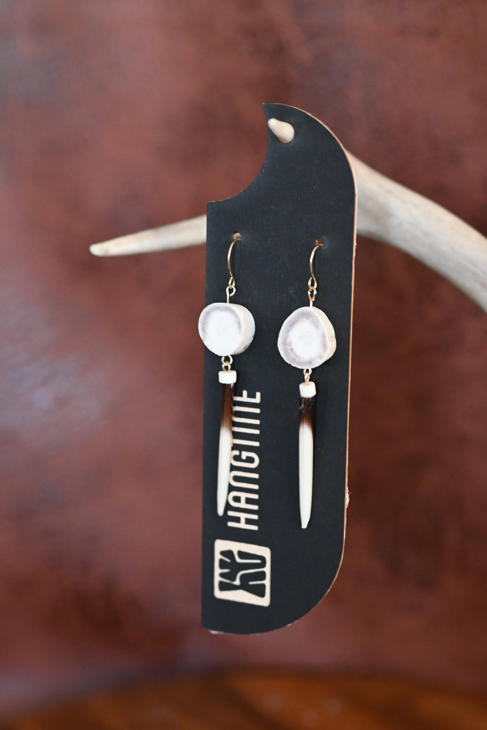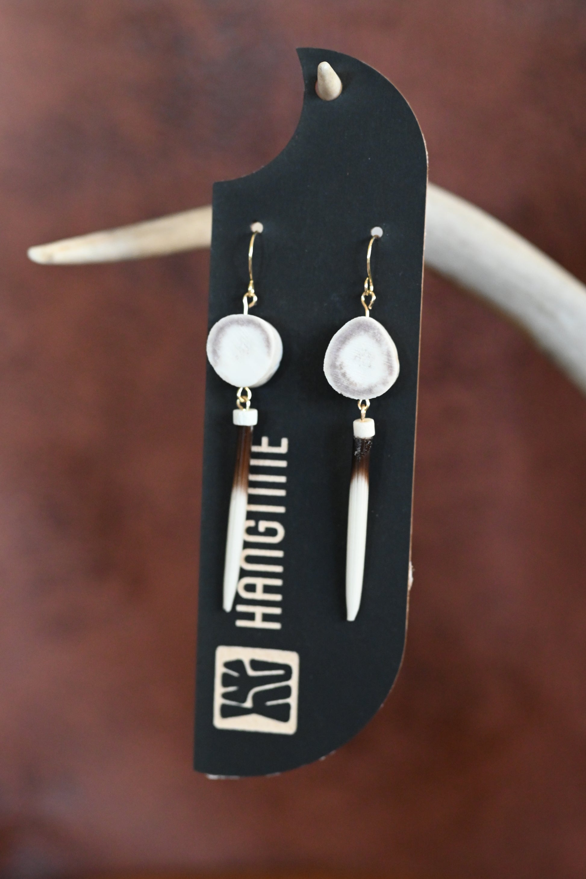 The Ozzy captures bold, untamed style with its striking blend of natural materials. Crafted from genuine antler, bone beads, and African porcupine quills, these earrings deliver authentic western flair with an edge. They are extremely light weight and include 18k gold platted ear wires. These earrings measure approximately 3". Each pair showcases the raw beauty of nature's textures, smooth bone contrasts with the organic grain of antler and the distinctive quill details that set them apart. Perfect for those who appreciate statement pieces that tell a story, The Ozzy brings rugged sophistication to any look. Handcrafted artistry meets wearable art.