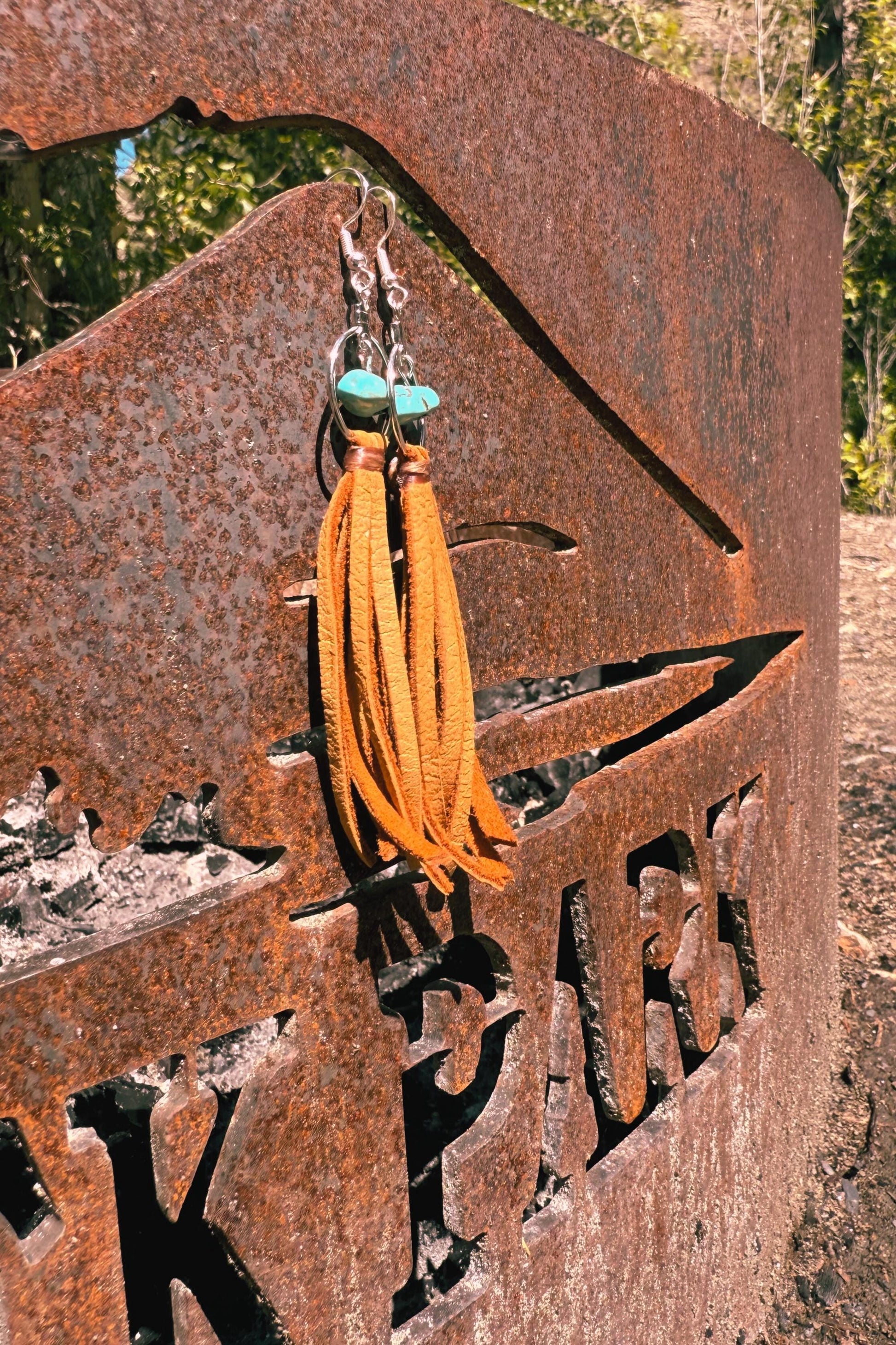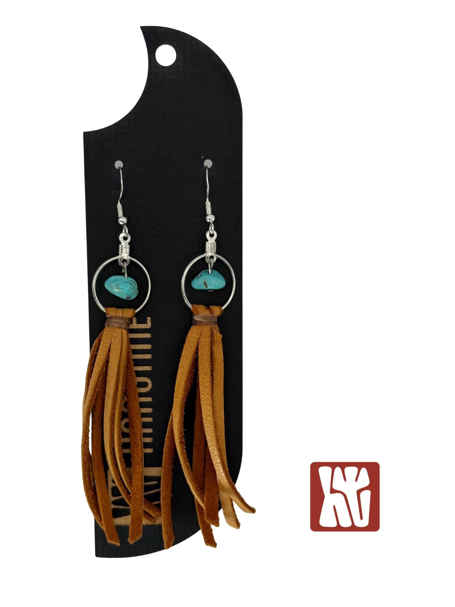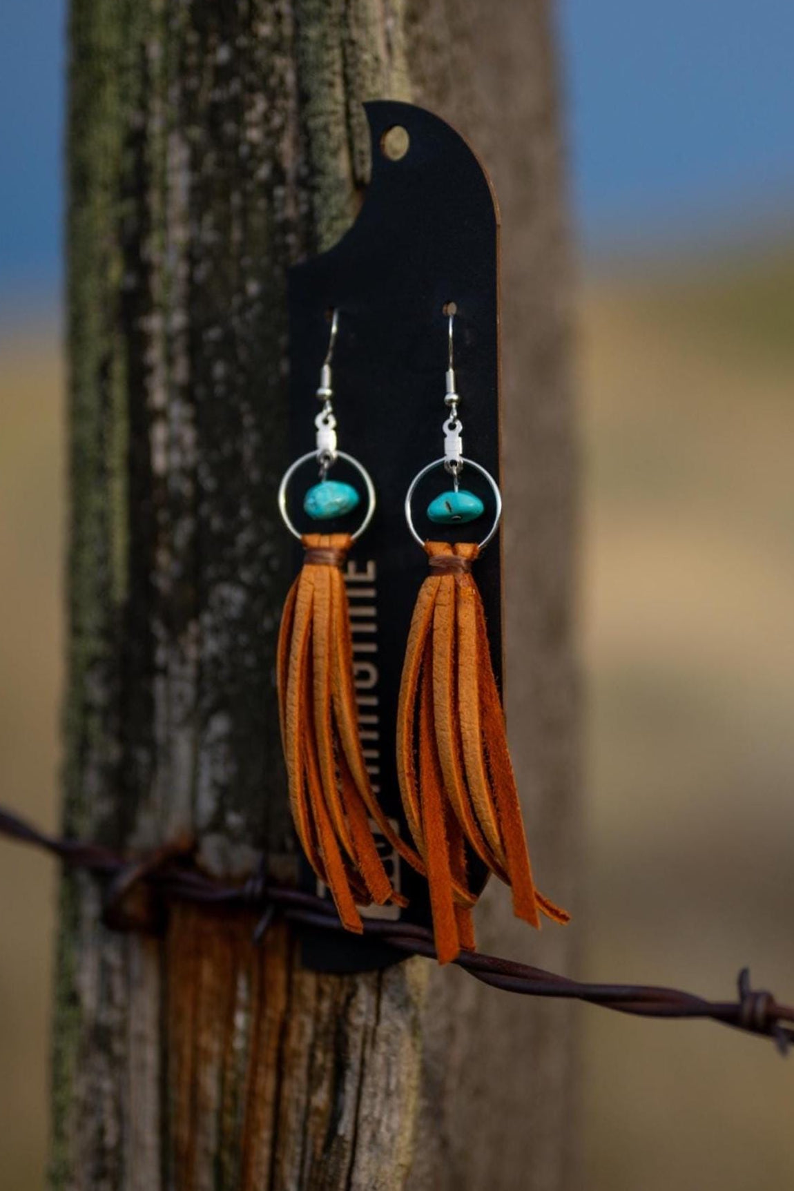 These leather fringe earrings call to mind weathered cowboy boots and sun faded saddles. Each pair reflects the raw beauty of the land it comes from. No two pieces are ever alike, each one carries the unique texture, color, and story of the materials used. The earrings are very lightweight and the earwires are sterling silver plated. They will measure approximately 4" in length (can easily be trimmed to your liking). The precise color of the leather may be slightly lighter or darker than pictured. The size of the turquoise beads will vary and be unique to each pair of earrings. These are just perfect for the Western dreamers and the barefoot dancers!
