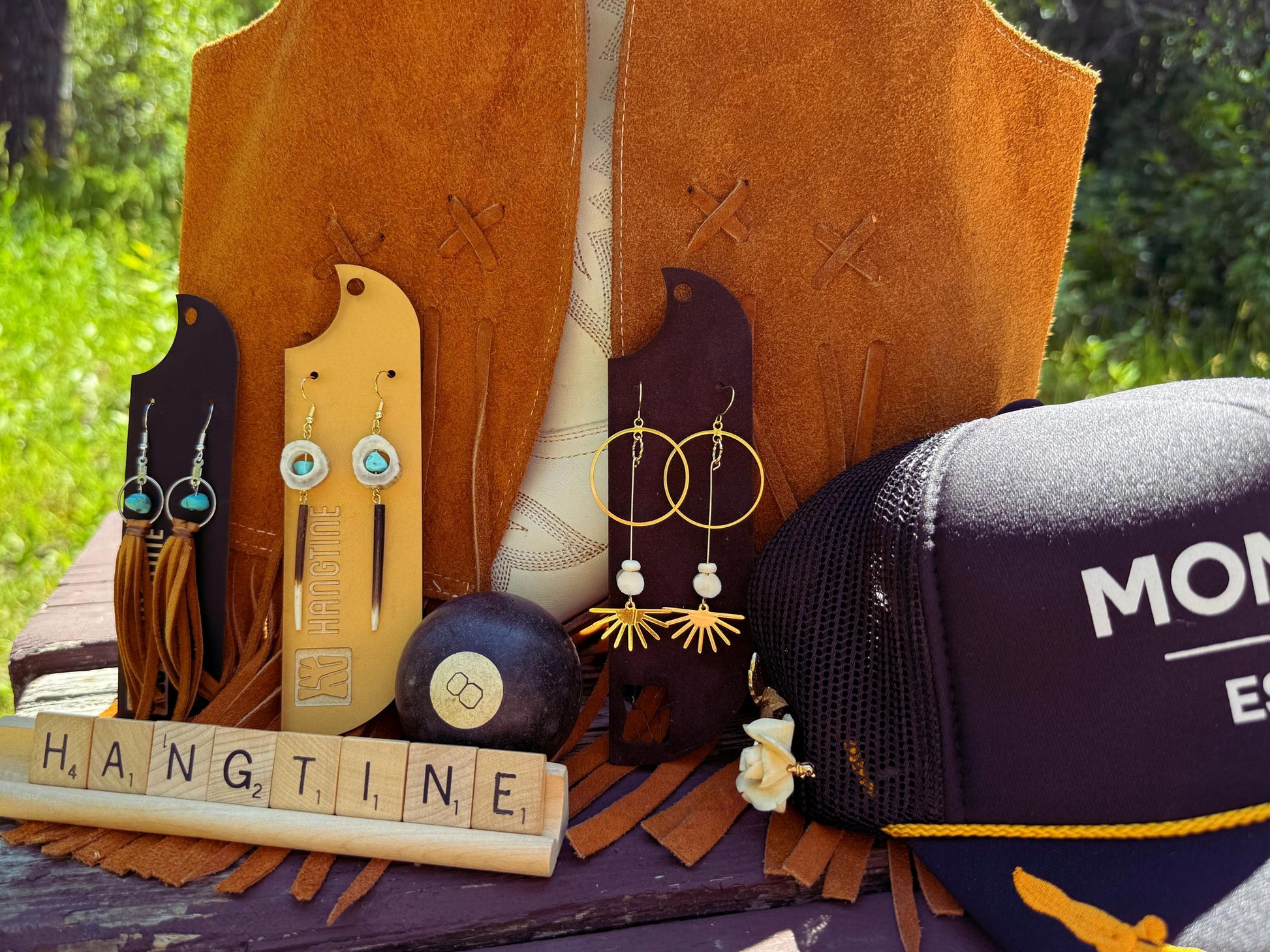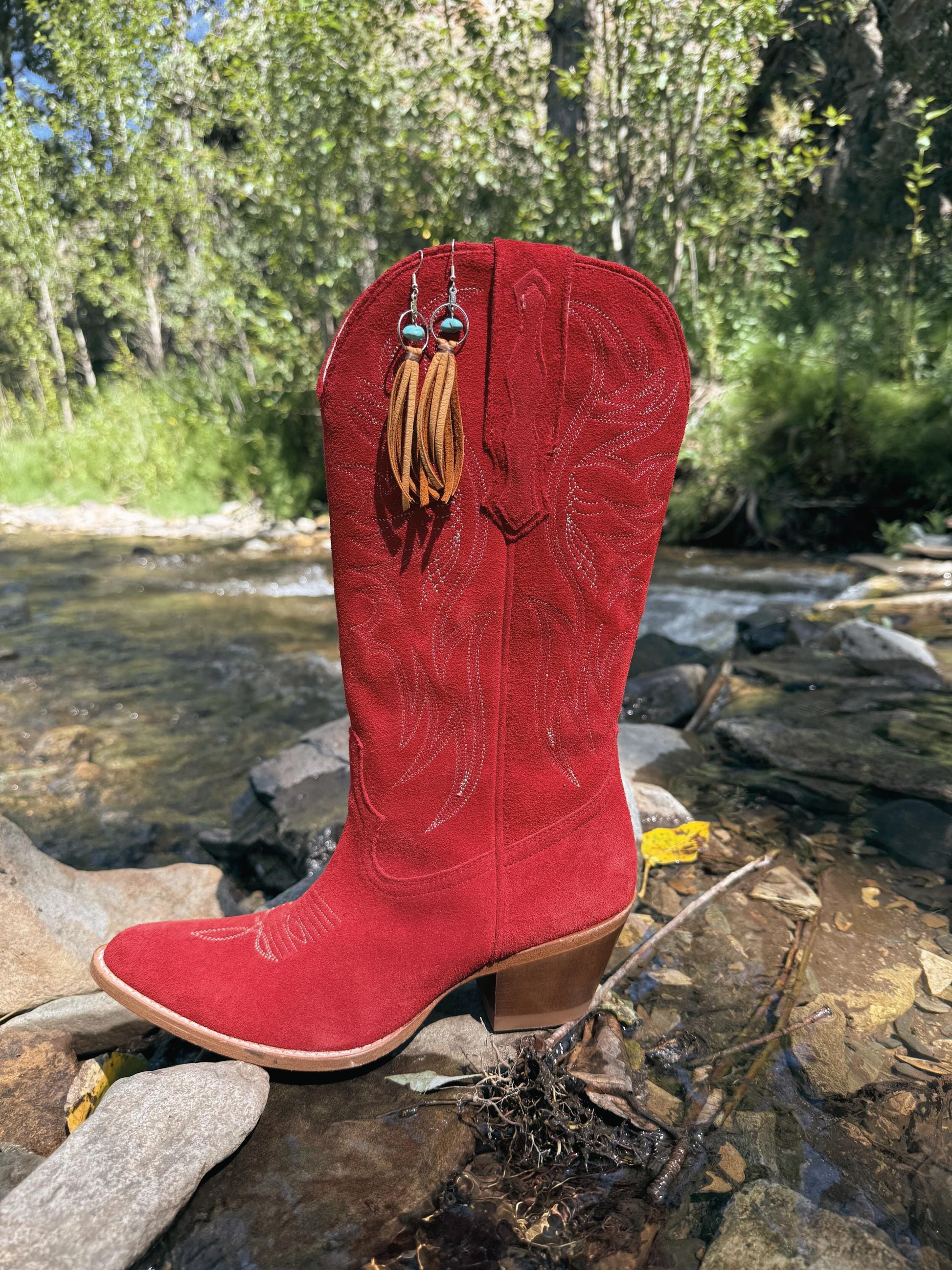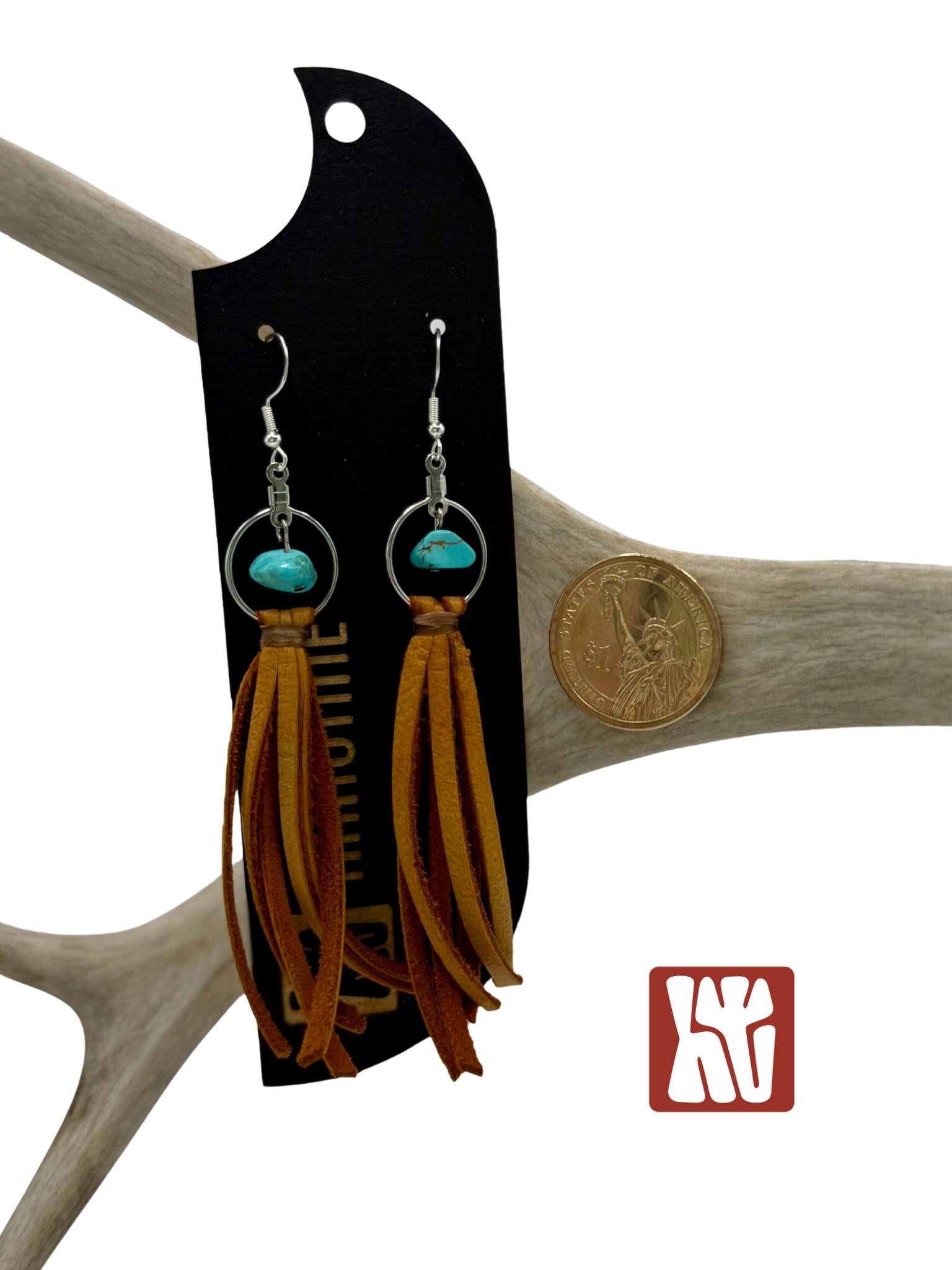 These leather fringe earrings call to mind weathered cowboy boots and sun faded saddles. Each pair reflects the raw beauty of the land it comes from. No two pieces are ever alike, each one carries the unique texture, color, and story of the materials used. The earrings are very lightweight and the earwires are sterling silver plated. They will measure approximately 4" in length (can easily be trimmed to your liking). The precise color of the leather may be slightly lighter or darker than pictured. The size of the turquoise beads will vary and be unique to each pair of earrings. These are just perfect for the Western dreamers and the barefoot dancers!